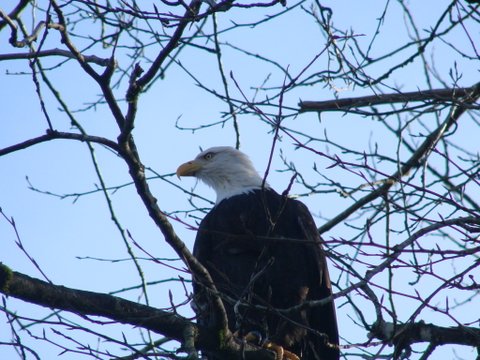 Shortly after viewing the first, we saw a younger eagle in a tree. The younger ones don’t have the typical white head – that comes with age (at about age 5).