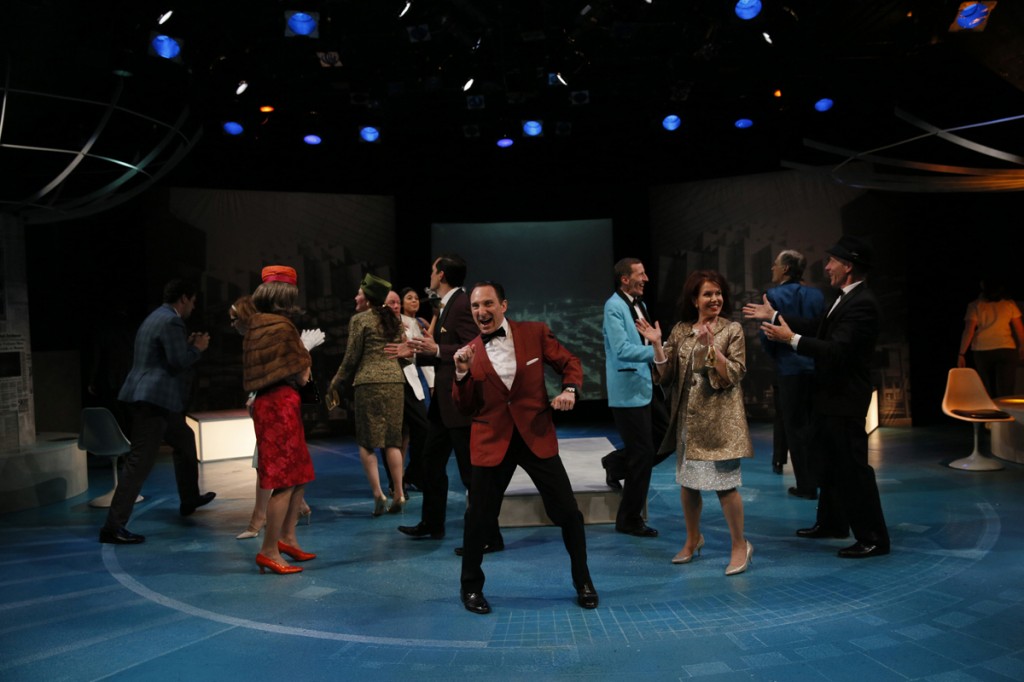 Actors Chris Ensweiler and Jennifer Lee Taylor were superb as the charismatic Roger Morgan (“Mr. Seattle”) and Helen Gulanos, the eager reporter hoping to expose the skeletons in Roger’s closest. The rest of the cast were equally adept at changing time periods and alternating characters. The transitions between the two time periods were cleverly handled, with the main characters performing mock strip teases to hip 60s tunes while changing into costumes to suit the times. The costumes marvelously depicted the days of Camelot and Jackie Kennedy as well as the more modern, but conservative attire of the early 2000s.The set was simple but effective, with large video screens projecting photos of the appropriate eras and relevant Seattle scenes such as the Fremont Troll and Starbucks.