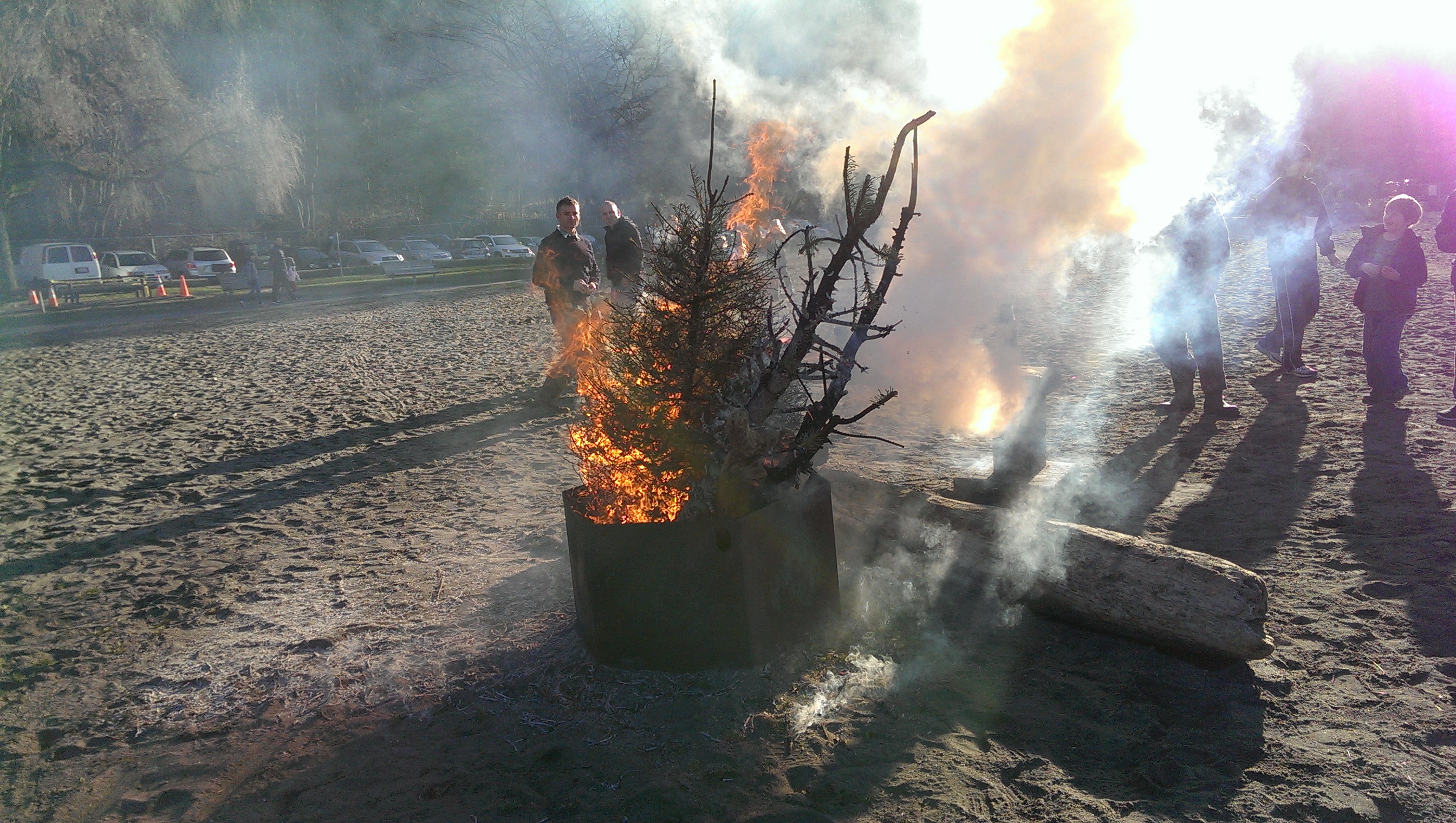 Lots of people had brought their Christmas trees. They were congregated around fire pits, but few were actually burning their trees. One group of onlookers who had already burnt their tree invited us to join their fire and burn ours.