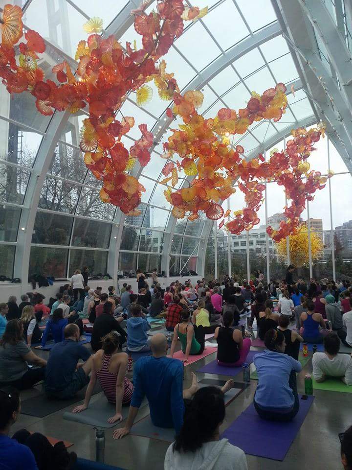 For those of you who have not yet been to the Chihuly Garden and Glass exhibit, it’s a must-see here in Seattle. The Glass House is a 40 foot tall structure covering over 4500 square feet of space. The main installation, which we found is best viewed while laying flat on your yoga mat, is the 100 foot long pallette of flowers suspended from the ceiling, with colors ranging from yellow to red, orange to amber. This is one of Chihuly’s largest suspended sculptures and the colors, depending on the natural light and time of day, vary slightly. We were there on a cloudy day with bits of rain and sun and I noticed this change. Or perhaps it was just because my chi was perfectly aligned.