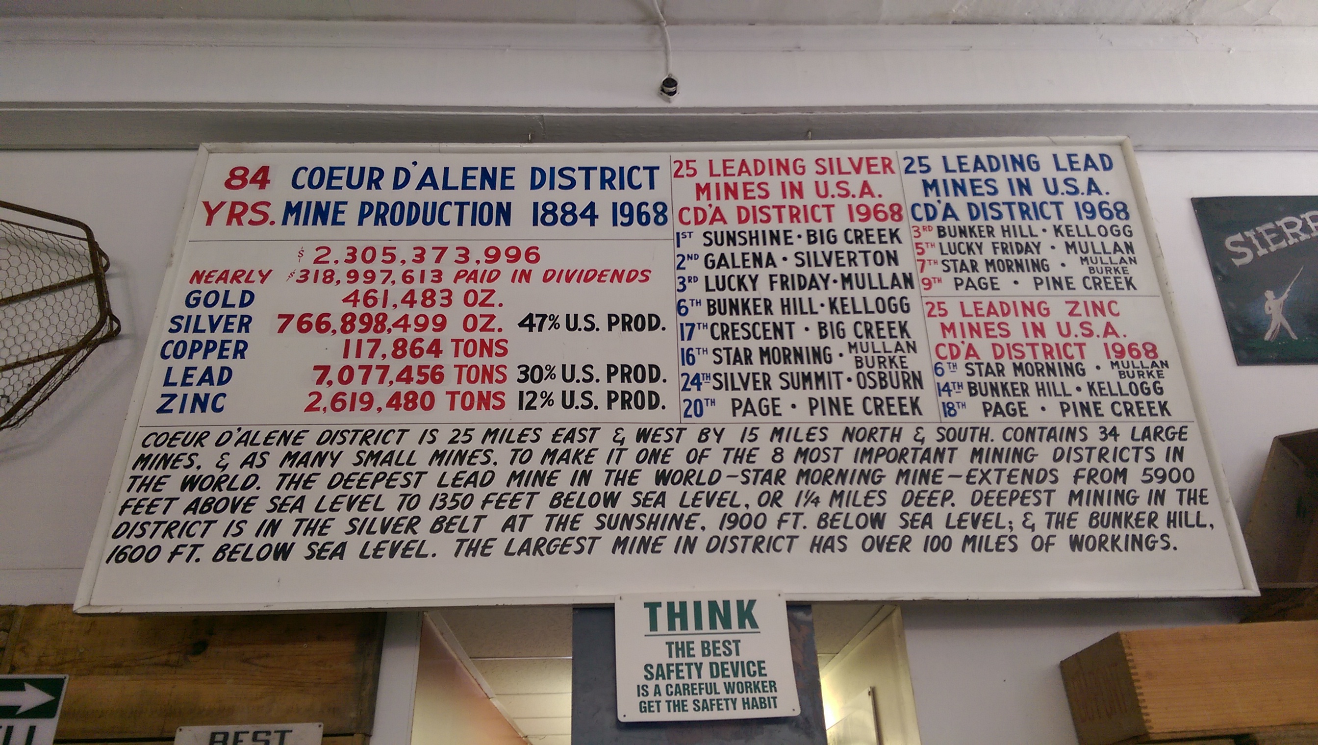 The Center of the Universe (at the center of this intersection) is commemorated on a manhole cover decorated with the names of each of the four mining companies – the Bunker Hill Mine (BHM), the Coeur d’Alene Mines Corporation (CDE), the Helca Mining Company (HL), and the Sterling Mining Company (SRLM).
