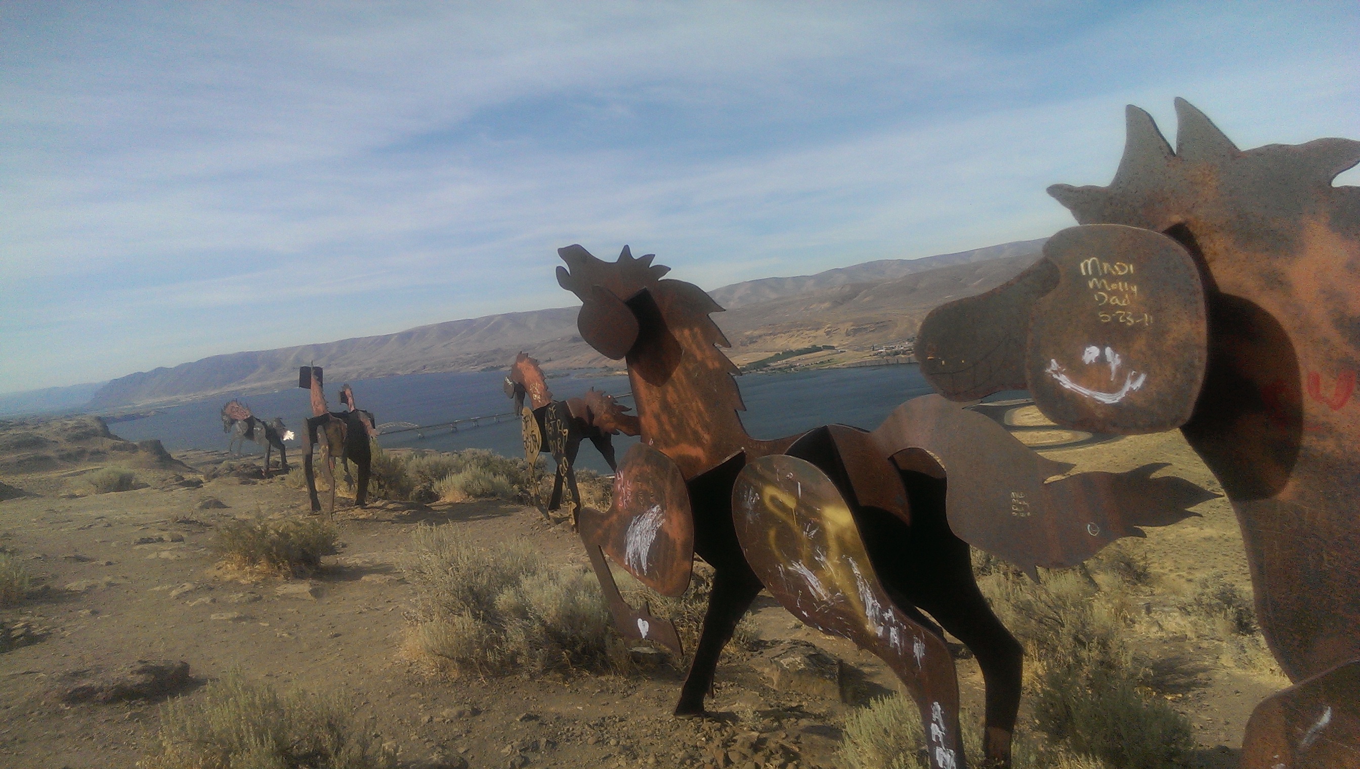 Just east of Vantage, Washington (a fascinating town in itself – you can read about our visit to Vantage here), we spotted these amazing horses up on the hill. Not a stampede, but a series of ironwork statues which form the Wild Horses Monument – although the real name of this installation is “Grandfather Cuts Loose the Ponies”. We parked in the lot and climbed the short hillside footpath up to the statues which have a wonderful view of the Columbia River below. These 15 life-size “horses” were created by sculptor David Govedare for the state’s centennial in 1989.