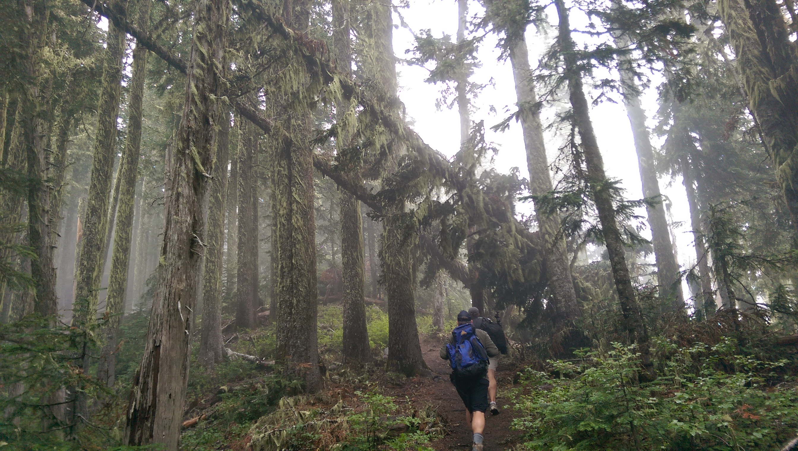 to what we can only assume are spectacular views of Mt. Rainier and surrounding mountains. We have to assume, because when we did the hike, the trail was surrounded in mist and clouds. But it was still offered wonderful scenery.