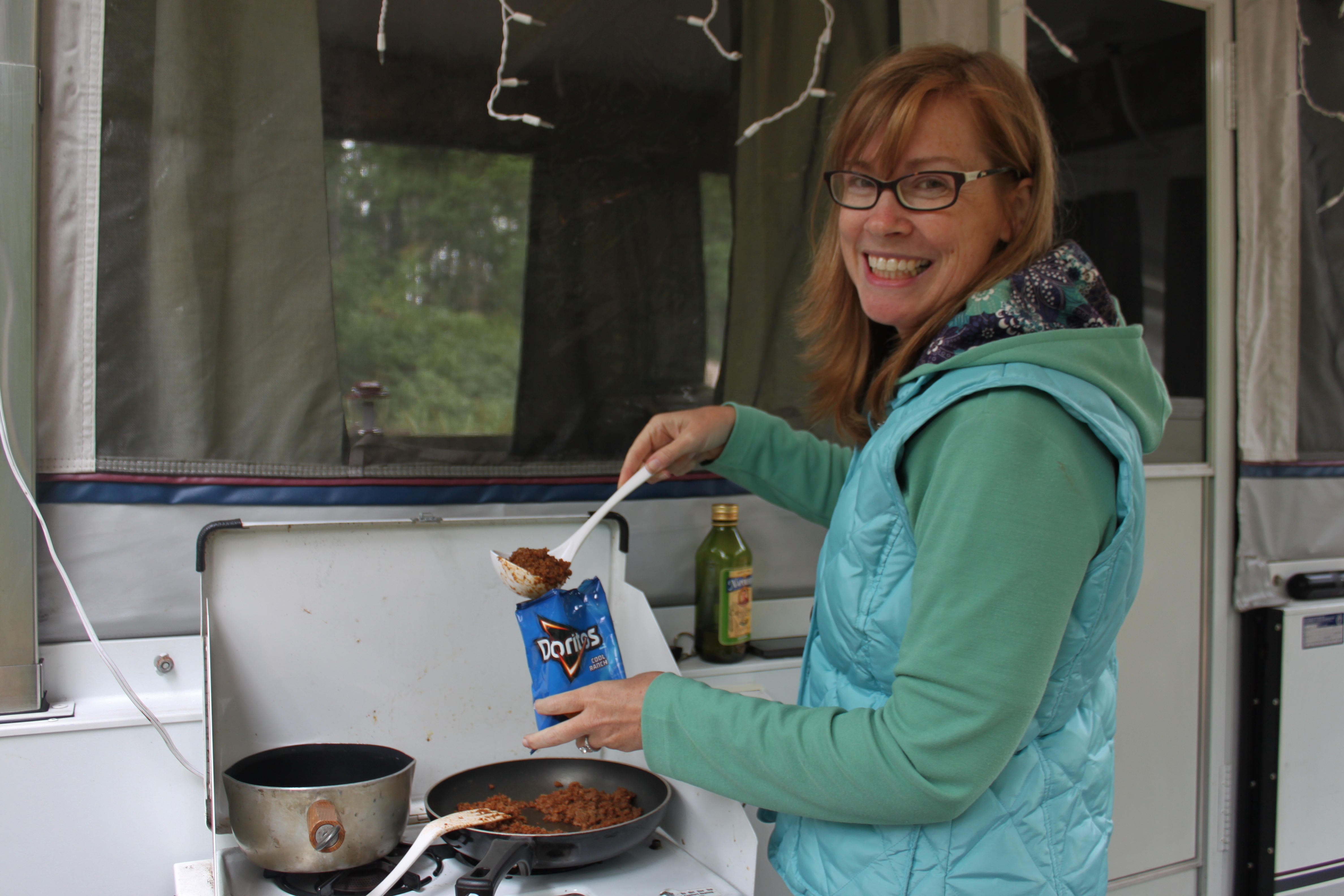 What doesn’t make things easy, however, is when there is a burn ban in effect only in this one small county in Washington State, despite the rains. Only propane grills were allowed. But Crystal and Troy were quick on their feet and bought some small propane grills so we could improvise our campfire.