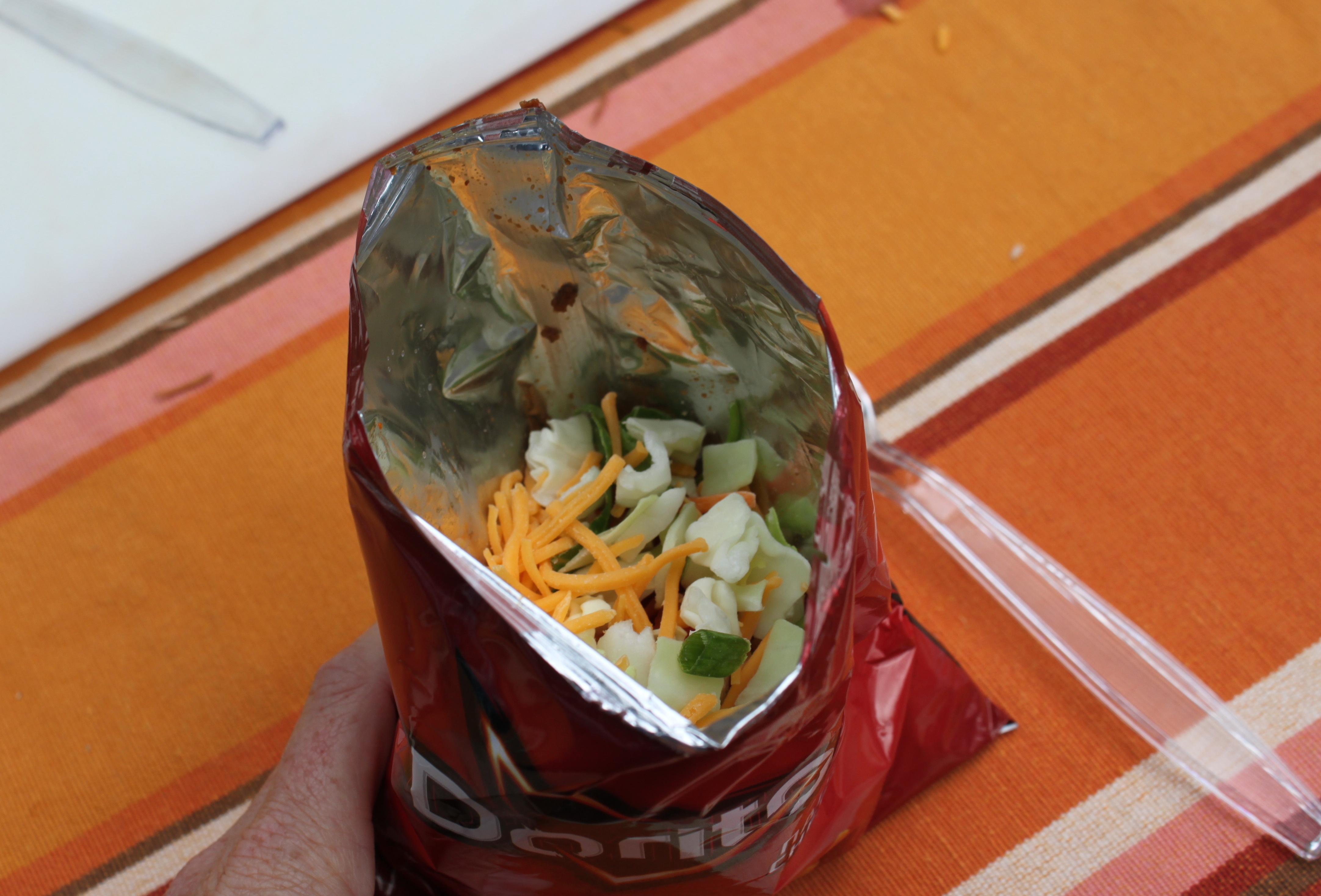 • Taking individual packets of Doritos (or other chips), crush the bag so that the chips break into small pieces. Once sufficiently crushed, open the bag and add one portion of cooked ground beef, then add the chopped tomatoes, onions, lettuce and some shredded cheddar cheese. Top with hot sauce. Stir within the mini Doritos bag, and then eat out of the bag with a plastic fork.