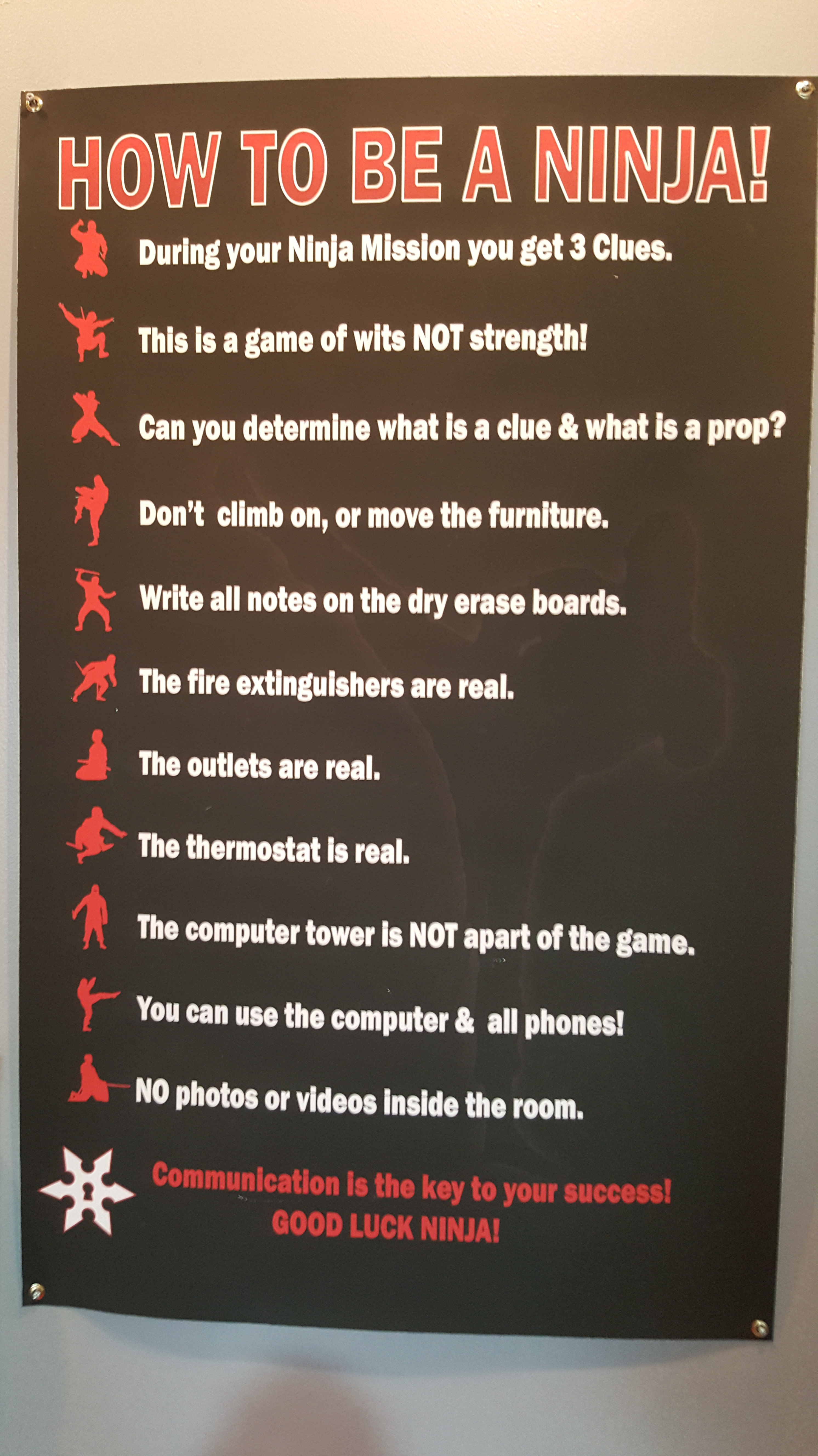 The Ninja Escape staff watched us on video cameras and they allowed us to hold up a sign stating “Need a Clue” from time to time. We were allowed three clues and I believe we only requested two. The staff, however, would also call us on the room phone if they saw us veering too far offtrack.