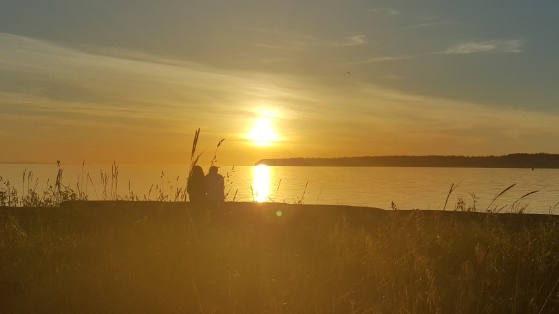After a delicious meal, we took our position in a couple adirondack chairs and enjoyed the sunset. The bay is calm and the sun nestles itself between the mountains off in the distance. This is, by any measure, a perfect end to any long day on the road, so we soaked it in.